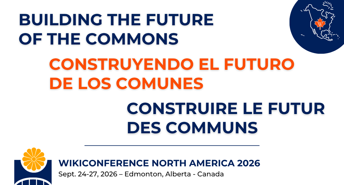 WikiConference North America 2026 will take place in Edmonton, Alberta (Canada) on September 25–27, 2026, with the Culture Crawl happening on September 24. This year’s theme is: Building the Future of the Commons.